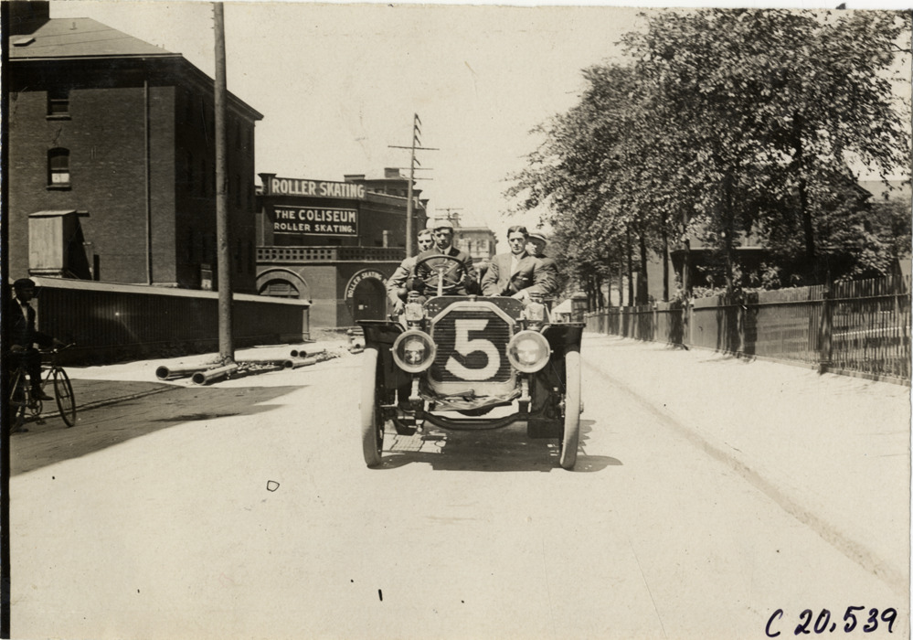 Front view of motorists posing in Peerless car no. 5 at Buffalo, New York during the 1908 Glidden Tour. Coliseum roller skating rink in background. Handwritten on back: "Tours--Glidden Tour, 1908."