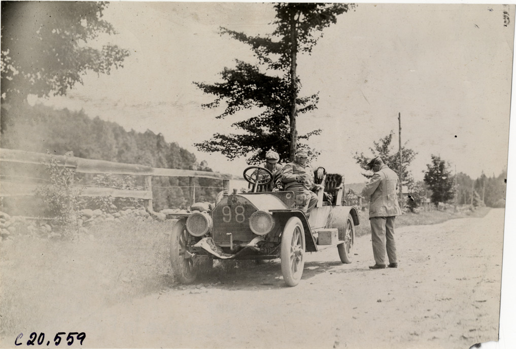 View of Dai H. Lewis and motorists with Premier pilot car no. 98 on side of rural dirt road during the 1908 Glidden Tour. Handwritten on back: "Tours--Glidden Tour, 1908."