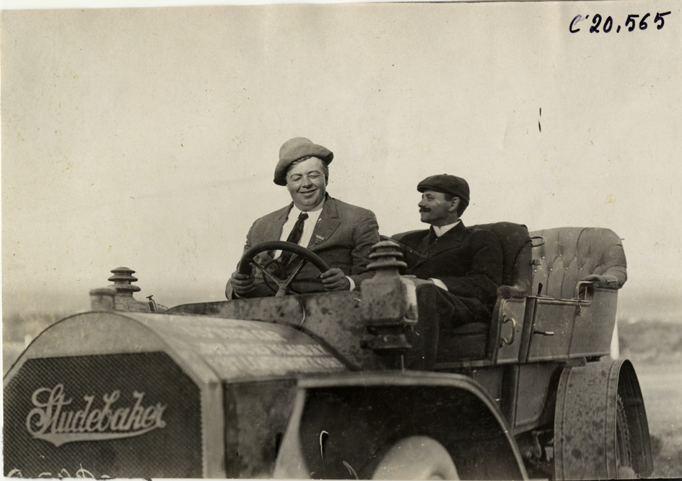 Driver and passenger in Studebaker automobile, 1908 Glidden Tour