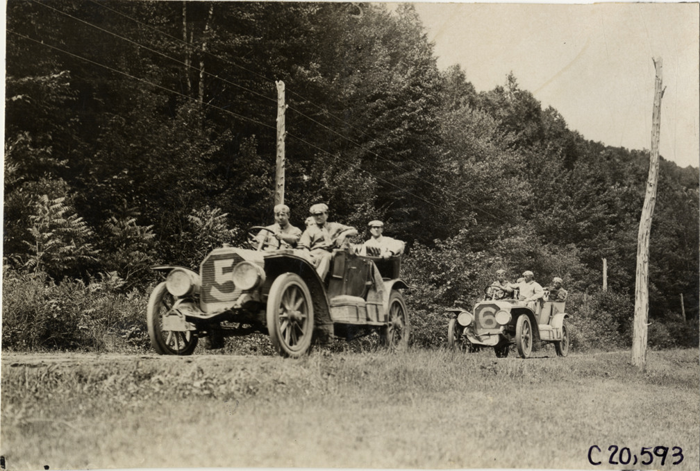 Favorite this☆ Motorists in Peerless automobiles traveling on mountain road, 1908 Glidden Tour Description: View of motorists in Peerless cars no. 5 and no 6 traveling on mountain road during the 1908 Glidden Tour. Handwritten on back: "Tours--Glidden Tour, 1908." Details Resource ID: na023164 Subject: Peerless automobile Mountain roads Glidden Tour (1908) Automobile driving--Competitions--United States Photographic prints Date Issued: 1908-07 Format: 1 photographic print ; 4.5 x 6.75 in. Member of: National Automotive History Collection Lazarnick Collection Filing Location: Tours--Glidden Tour, 1908 #5 Negative Number: Negative #C20,593 Rights: Physical rights are retained by DPL. Copyright is retained in accordance with U.S. copyright laws.