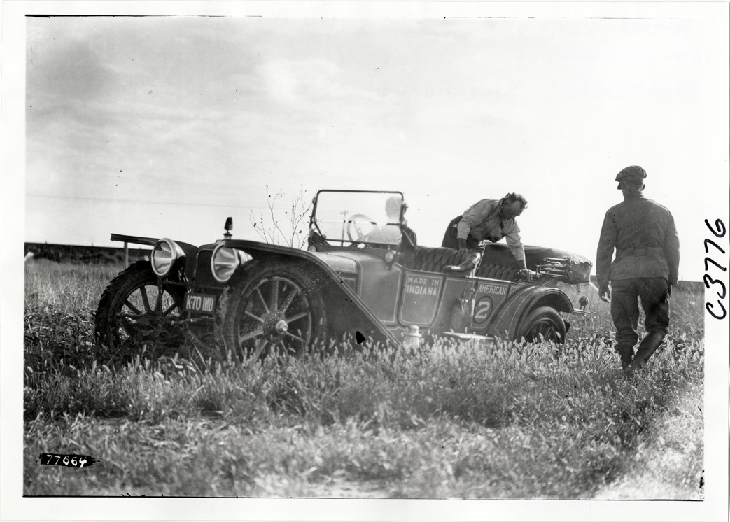 View of motorists with American car no. 2 on rural road during the 1913 transcontinental tour organized by Indiana Automobile Manufacturers' Association. Handwritten on back: "#2 American. Passengers: Ray Price, Dr. C.R. Strickland, Eddie Gouth. Tours--I.A.M.A, 1913."