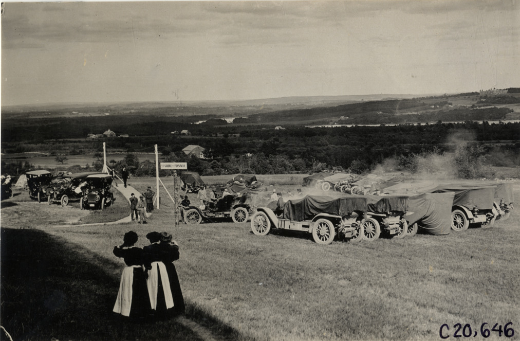 Automobiles parked in field at Poland, Maine, 1908 Glidden Tour