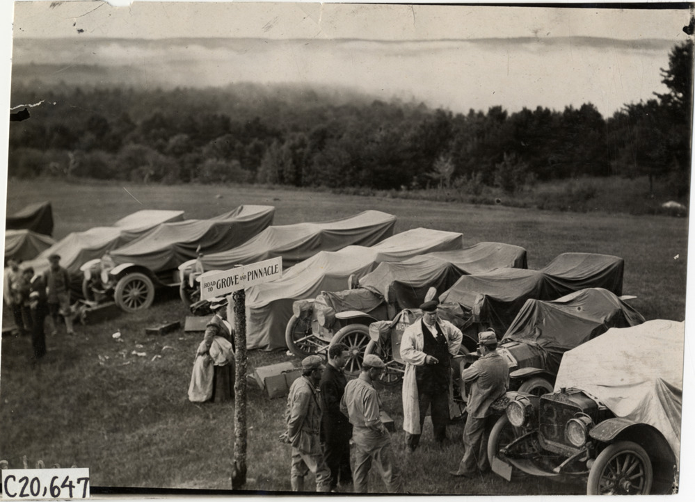 View of cars, covered with tarpaulins, parked in field at Poland, Maine during the 1908 Glidden Tour. Group of men and "Road to grove and pinnacle" sign in foreground. Handwritten on back: "Tours--Glidden Tour, 1908."