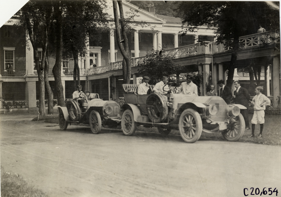 Pierce Great Arrow automobiles parked in front of Bedford Springs Hotel at Bedford, Pennsylvania, 1908 Glidden Tour