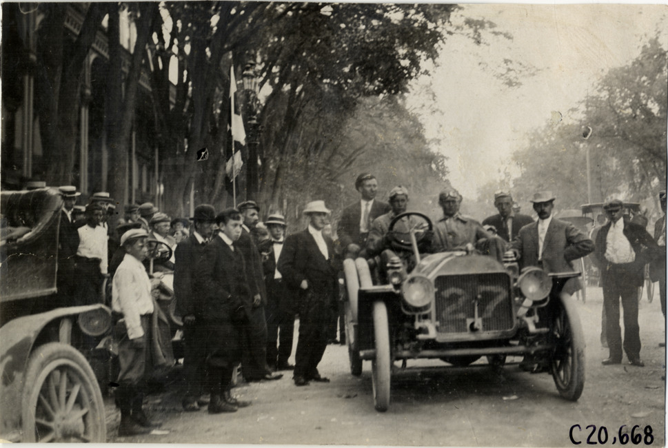 View of motorists posing in Oakland car no. 27 at Saratoga Springs, New York, surrounded by spectators, during the 1908 Glidden Tour. Handwritten on back: "Tours--Glidden Tour, 1908."