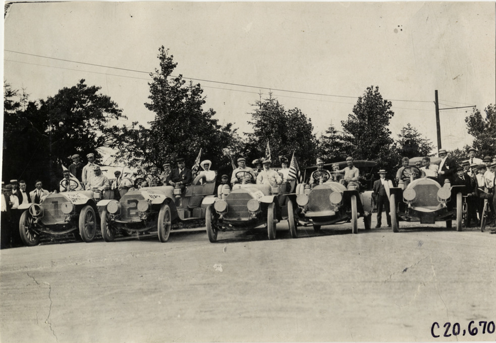 Favorite this☆ Motorists posing in automobiles, 1908 Glidden Tour Description: View of motorists posing in cars decorated with flags during the 1908 Glidden Tour. Pierce Great Arrow cars no. 1 and no. 2 on left. Handwritten on back: "Tours--Glidden Tour, 1908." Details Resource ID: na023242 Subject: Automobiles Pierce-Arrow automobile Glidden Tour (1908) Automobile driving--Competitions--United States Photographic prints Date Issued: 1908-07 Format: 1 photographic print ; 4.5 x 6.5 in. Member of: National Automotive History Collection Lazarnick Collection Filing Location: Tours--Glidden Tour, 1908 #8 Negative Number: Negative #C20,670 Rights: Physical rights are retained by DPL. Copyright is retained in accordance with U.S. copyright laws.