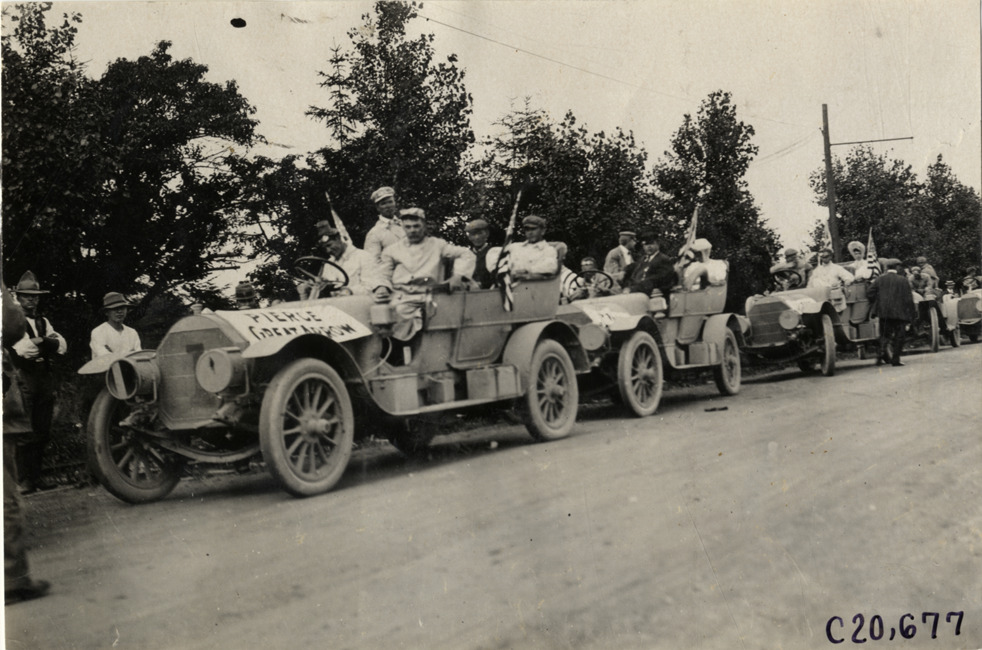 View of motorists in cars lined up in road during the 1908 Glidden Tour. Pierce Great Arrow car no. 1 in lead. Handwritten on back: "Tours--Glidden Tour, 1908."