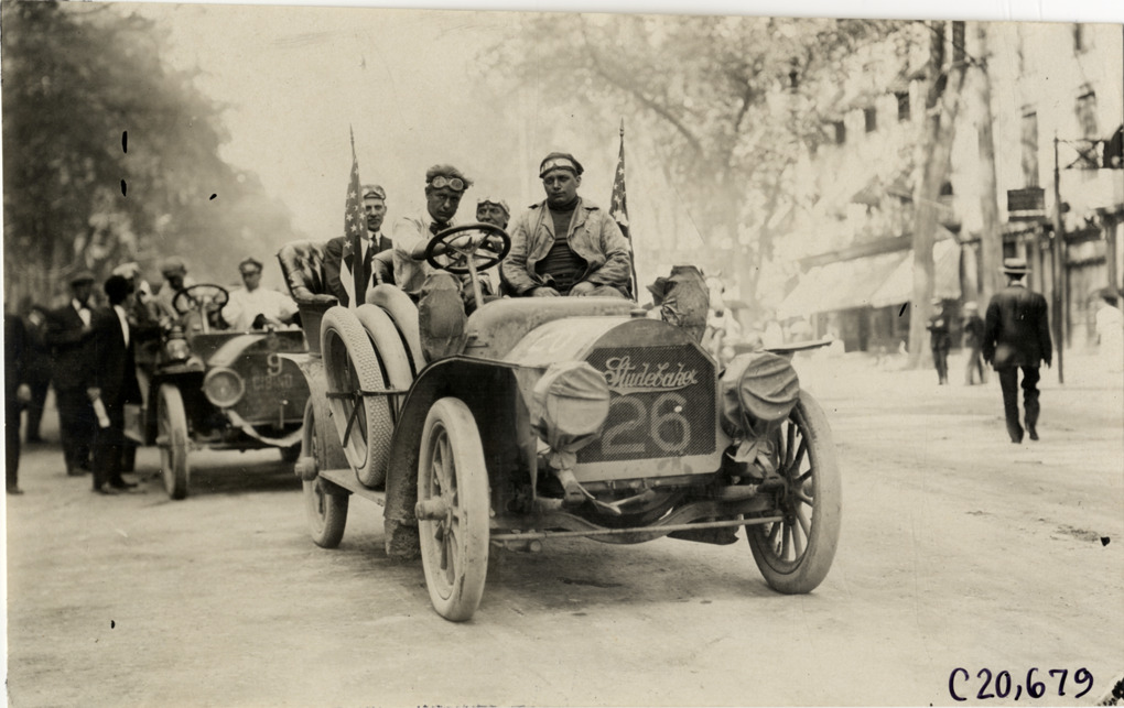 View of motorists posing in Studebaker car no. 26 during the 1908 Glidden Tour. Handwritten on back: "Tours--Glidden Tour, 1908."