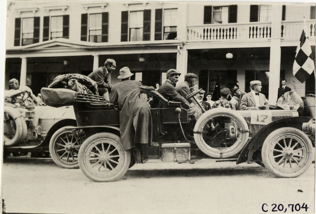 Favorite this☆ Motorists with Stevens-Duryea automobile, 1908 Glidden Tour Description: View of motorists with Stevens-Duryea car no. 17 during the 1908 Glidden Tour. Hotel in background. Handwritten on back: "Tours--Glidden Tour, 1908." Details Resource ID: na023276 Subject: Automobiles Stevens-Duryea Company Glidden Tour (1908) Automobile driving--Competitions--United States Photographic prints Date Issued: 1908-07 Format: 1 photographic print ; 4.75 x 6.75 in. Member of: National Automotive History Collection Lazarnick Collection Filing Location: Tours--Glidden Tour, 1908 #10 Negative Number: Negative #C20,704 Rights: Physical rights are retained by DPL. Copyright is retained in accordance with U.S. copyright laws.