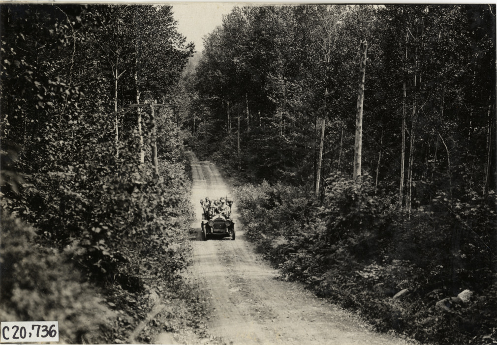 Distant view of motorists in car traveling on dirt road through wooded area during the 1908 Glidden Tour. Handwritten on back: "Tours--Glidden Tour, 1908."