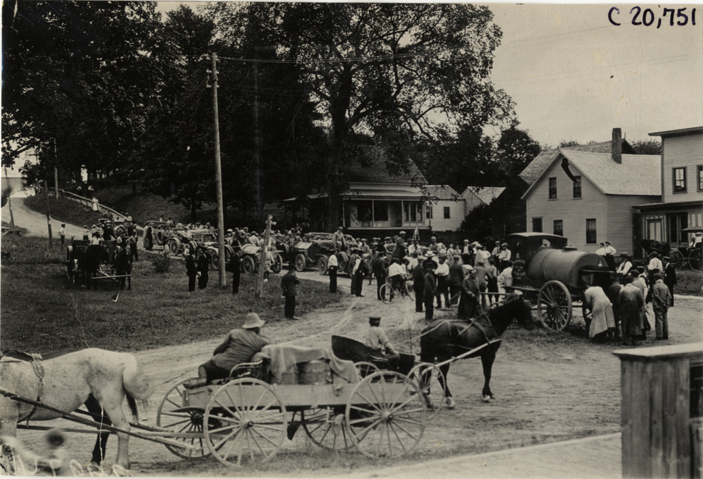 View of spectators surrounding cars lined up in road during the 1908 Glidden Tour. Horse-drawn wagons in foreground; wagon carrying cylindrical water tank in background. Handwritten on back: "Tours--Glidden Tour, 1908."
