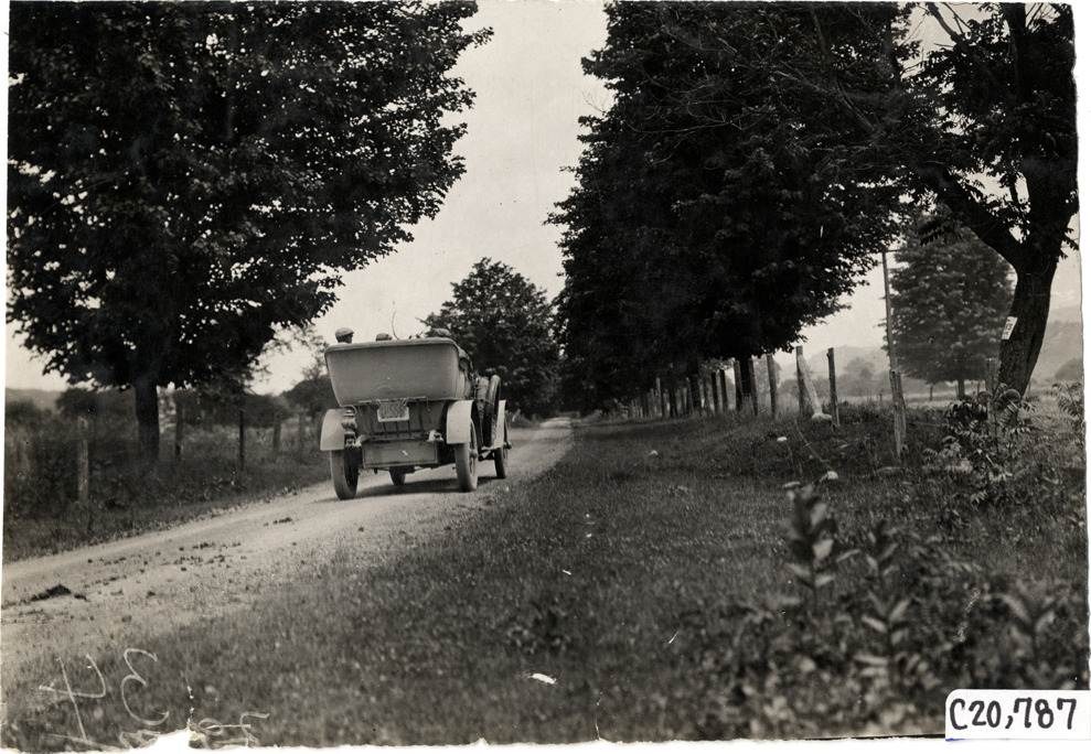 Rear view of motorists in car traveling on rural dirt road during the 1908 Glidden Tour. Stamped on back: "Spooner & Wells, Inc., photographers, telephones 3472-3473 Columbus, 1931 Broadway, New York." Handwritten on back: "Tours--Glidden Tour, 1908."