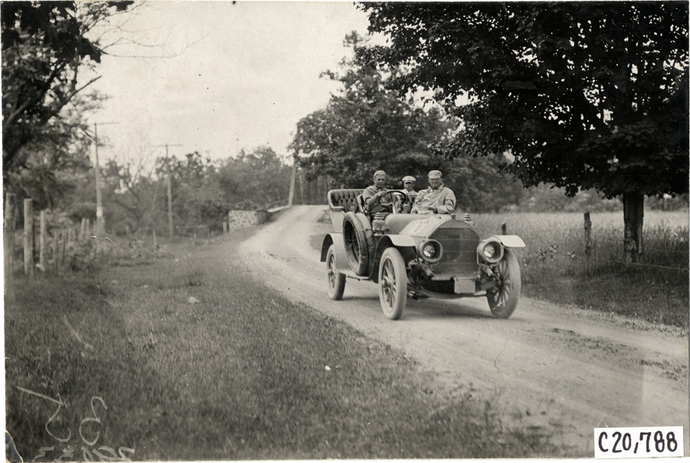 Motorists in automobile traveling on rural road, 1908 Glidden Tour