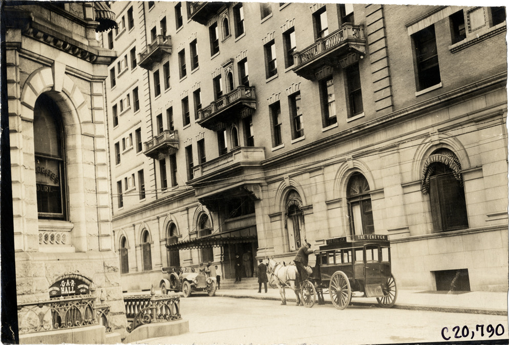 View of car and horse-drawn vehicle in front of Hotel Ten Eyck at Albany, New York during the 1908 Glidden Tour. "The Ten Eyck" sign on carriage; "G.A.R. Hall" painted in building window in foreground. Stamped on back: "Spooner & Wells, Inc., photographers, telephones 3472-3473 Columbus, 1931 Broadway, New York." Handwritten on back: "Tours--Glidden Tour, 1908."