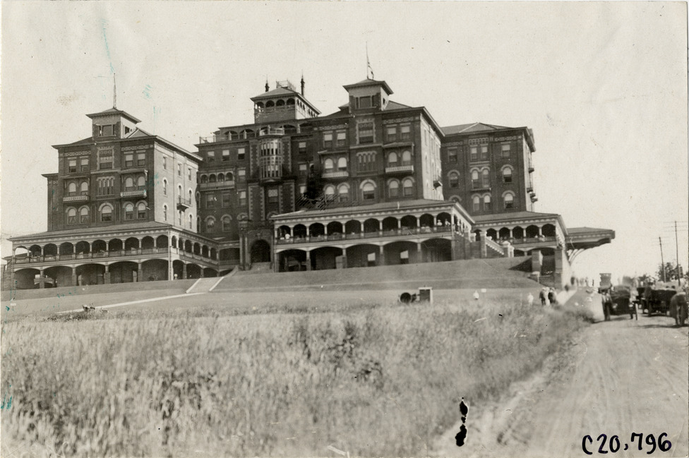 View of Hotel Rider at Cambridge Springs, Pennsylvania during the 1908 Glidden Tour. Handwritten on back: "Tours--Glidden Tour, 1908."