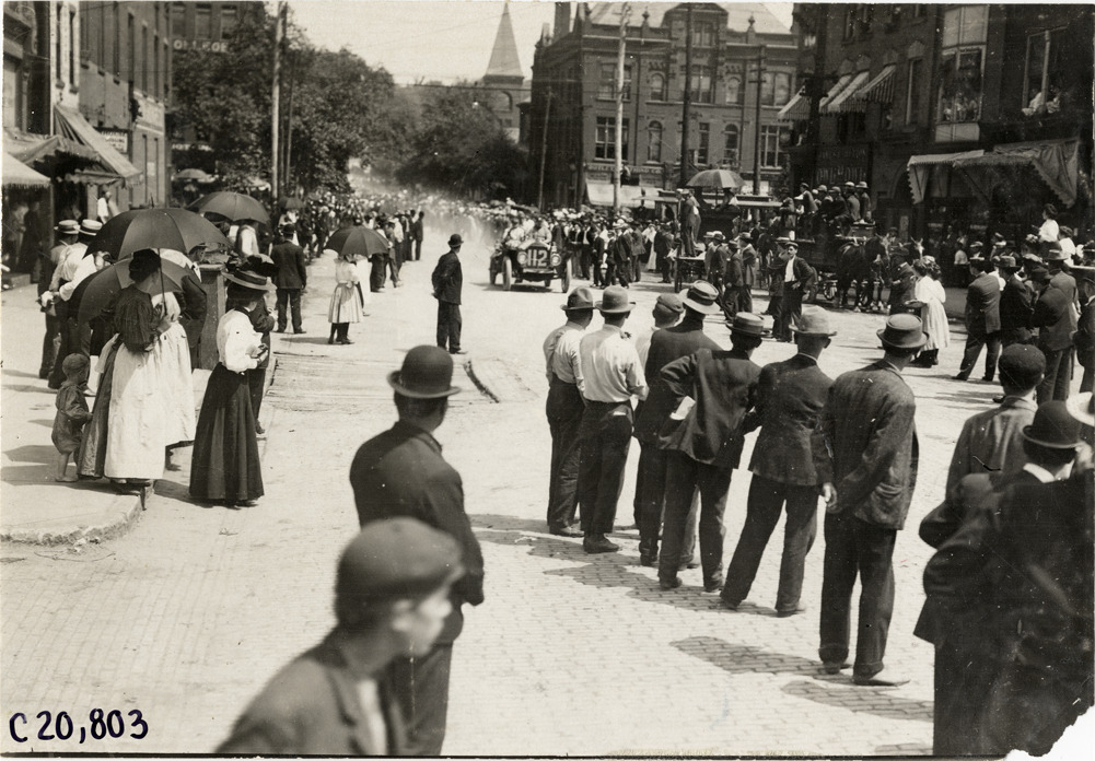 View of crowd watching motorists in car no. 112 during the 1908 Glidden Tour. Storefronts and commercial buildings in background. Handwritten on back: "Tours--Glidden Tour, 1908."