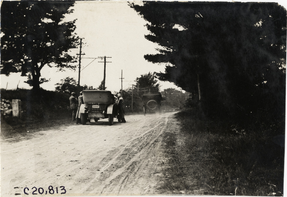 Rear view of motorists with car on roadside during the 1908 Glidden Tour. Car traveling in background. Stamped on back: "Spooner & Wells, Inc., photographers, telephones 3472-3473 Columbus, 1931 Broadway, New York." Handwritten on back: "Tours--Glidden Tour, 1908."