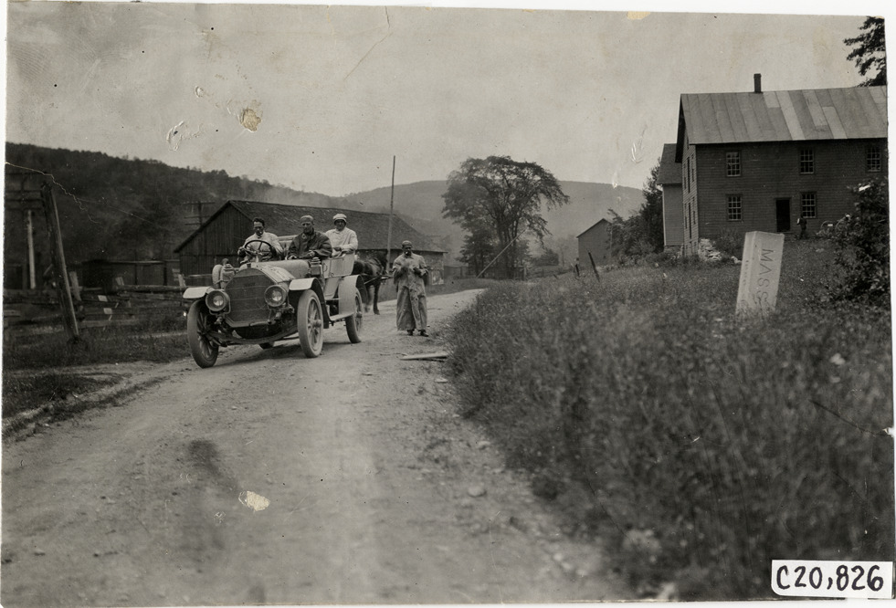 View of motorists posing in Pierce Great Arrow car no. 1 on rural dirt road during the 1908 Glidden Tour. Wooden-frame house and buildings in background. Handwritten on back: "Tours--Glidden Tour, 1908."