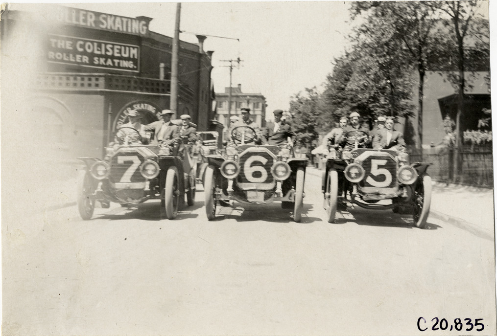 View of motorists posing in Peerless cars no. 5, no. 6 and no. 7 at Buffalo, New York during the 1908 Glidden Tour. Coliseum roller skating rink in background. Handwritten on back: "Tours--Glidden Tour, 1908."