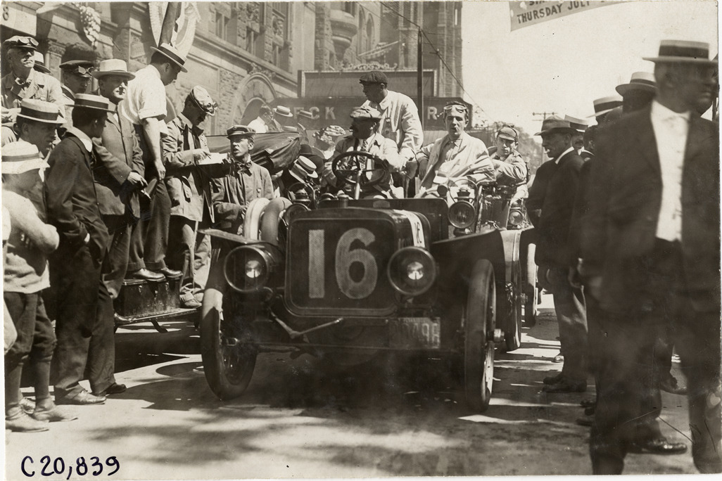 Close-up view of spectators surrounding motorists in Stevens-Duryea car no. 16 in front of the Teck Theatre at Buffalo, New York during the 1908 Glidden Tour. Handwritten on back: "Tours--Glidden Tour, 1908."