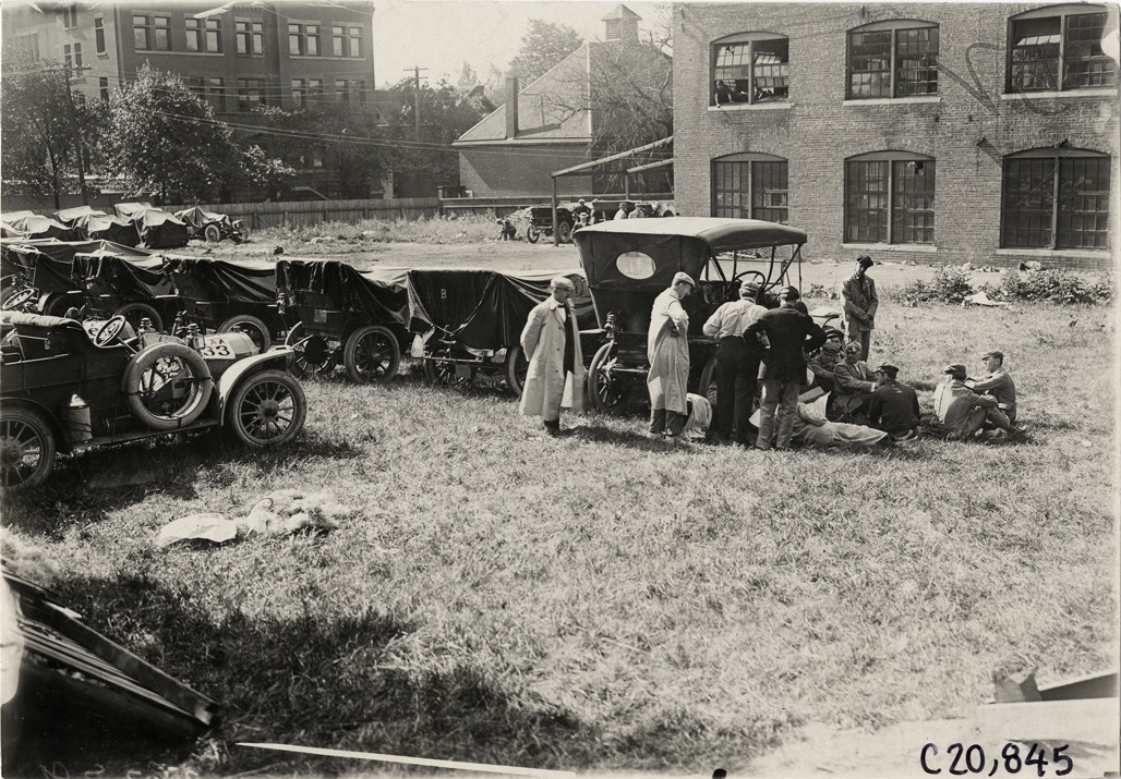 View of motorists relaxing next to cars parked in field at Buffalo, New York during the 1908 Glidden Tour. Field is adjacent to brick factory building. Handwritten on back: "Tours--Glidden Tour, 1908."
