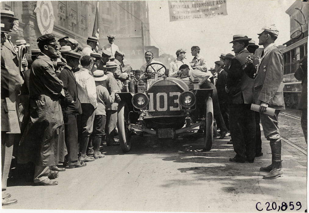 View of motorists in Pierce Great Arrow car no. 103, surrounded by spectators, in front of the Teck Theatre at Buffalo, New York during the 1908 Glidden Tour. Handwritten on back: "Tours--Glidden Tour, 1908."