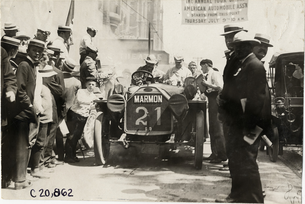 Motorists in Marmon automobile at Buffalo, New York, 1908 Glidden Tour