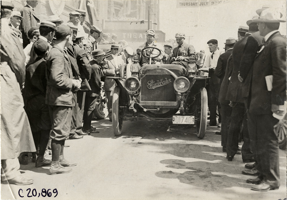 Motorists in Studebaker automobile at Buffalo, New York, 1908 Glidden Tour
