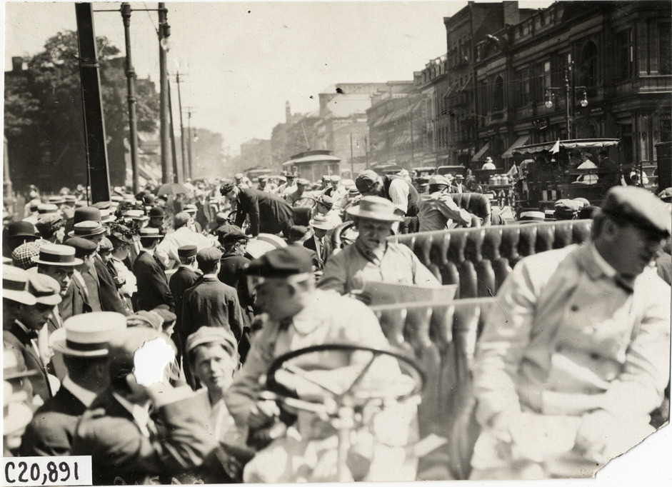Favorite this☆ Crowd surrounding automobiles in street, 1908 Glidden Tour Description: View of crowd of spectators surrounding cars in street during the 1908 Glidden Tour. Commercial buildings in background. Handwritten on back: "Tours--Glidden Tour, 1908." Details Resource ID: na023462 Subject: Crowds Glidden Tour (1908) Automobile driving--Competitions--United States Photographic prints Date Issued: 1908-07 Format: 1 photographic print ; 4.5 x 6.25 in. Member of: National Automotive History Collection Lazarnick Collection Filing Location: Tours--Glidden Tour, 1908 #17 Negative Number: Negative #C20,891 Rights: Physical rights are retained by DPL. Copyright is retained in accordance with U.S. copyright laws.