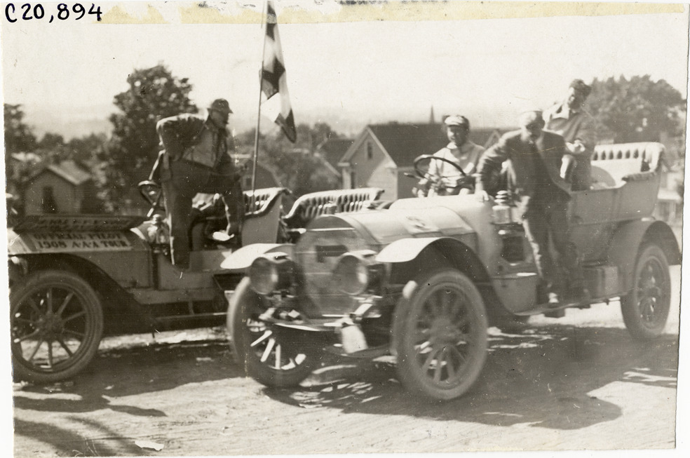 View of motorists in Pierce Great Arrow car no. 3 during the 1908 Glidden Tour. Dai H. Lewis stands in official pilot car in background. Handwritten on back: "Tours--Glidden Tour, 1908."