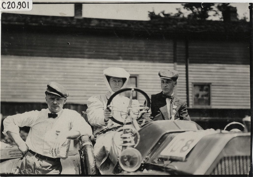 Close-up view of couple posing in Overland car no. 108 during the 1908 Glidden Tour. Woman sits behind the wheel; another man stands next to car. Handwritten on back: "Tours--Glidden Tour, 1908."