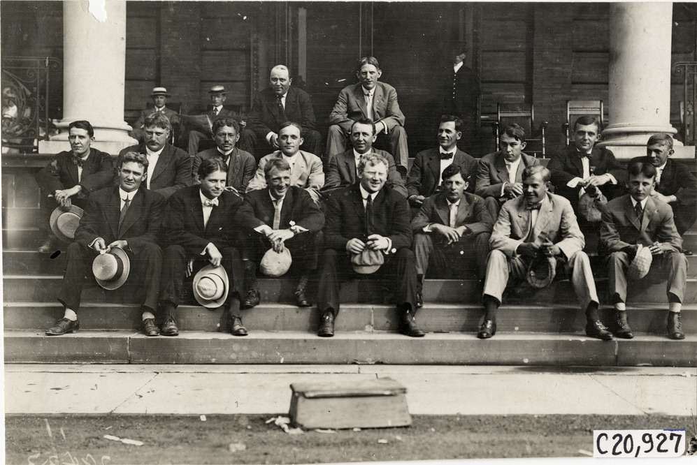 Favorite this☆ Men posing on building steps, 1908 Glidden Tour Description: Group portrait of men sitting on building steps during the 1908 Glidden Tour. Handwritten on back: "Tours--Glidden Tour, 1908." Details Resource ID: na023498 Subject: Portraits, Group Glidden Tour (1908) Automobile driving--Competitions--United States Photographic prints Date Issued: 1908-07 Format: 1 photographic print ; 4.5 x 6.75 in. Member of: National Automotive History Collection Lazarnick Collection Filing Location: Tours--Glidden Tour, 1908 #19 Negative Number: Negative #C20,927 Rights: Physical rights are retained by DPL. Copyright is retained in accordance with U.S. copyright laws.