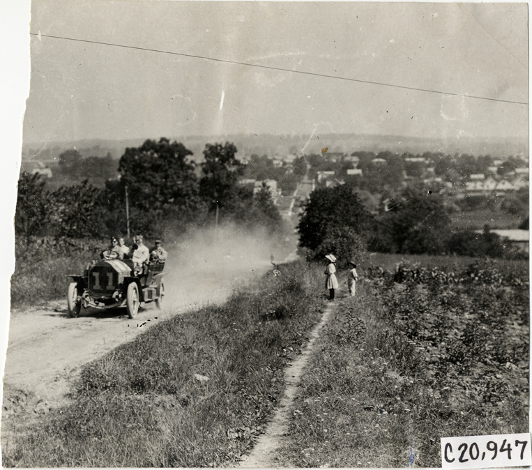 View of motorists in Thomas car no. 11 traveling on rural dirt road during the 1908 Glidden Tour. Boy and girl watch from roadside. Handwritten on back: "Tours--Glidden Tour, 1908."
