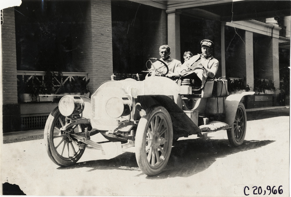 Motorists posing in automobile at Bedford, Pennsylvania, 1908 Glidden Tour