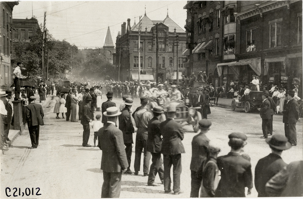 View of crowd watching motorists in Garford car no. 31 during the 1908 Glidden Tour. Storefronts and commercial buildings in background. Handwritten on back: "Tours--Glidden Tour, 1908."