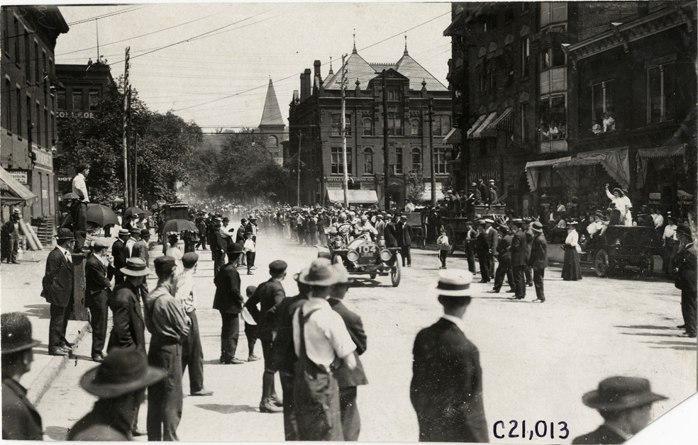 View of crowd watching motorists in Premier car no. 104 during the 1908 Glidden Tour. Storefronts and commercial buildings in background. Handwritten on back: "Tours--Glidden Tour, 1908."