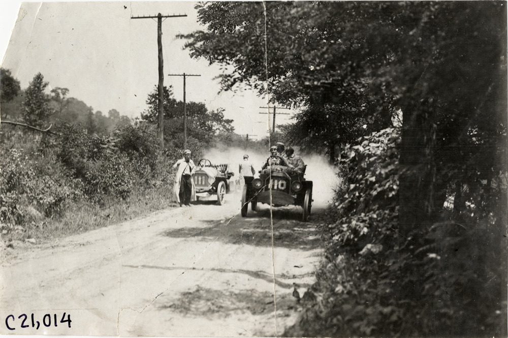 View of motorists in Overland car no. 110 passing group of motorists with Overland car no. 111 on side of rural dirt road during the 1908 Glidden Tour. Handwritten on back: "Tours--Glidden Tour, 1908."