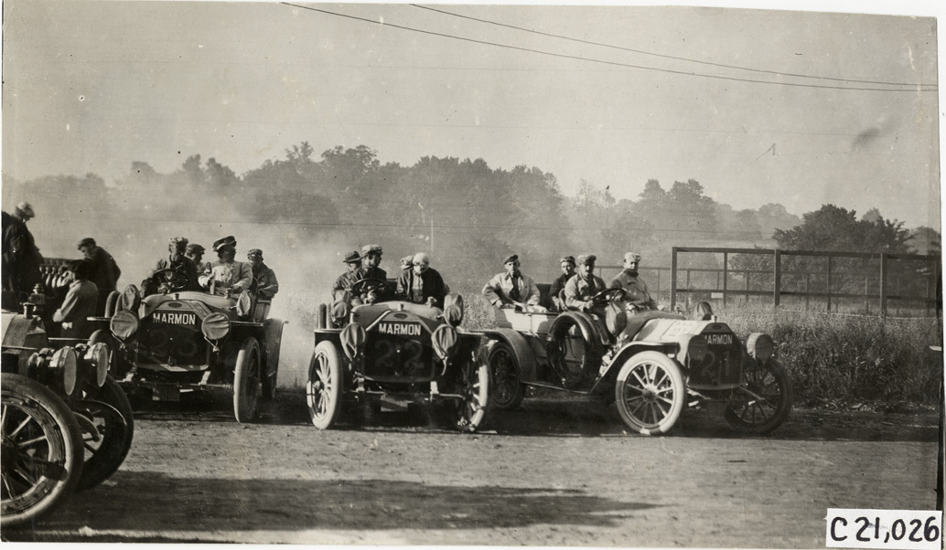 Favorite this☆ Motorists posing in Marmon automobiles, 1908 Glidden Tour Description: View of motorists posing in Marmon cars no. 21, no. 22 and no. 23 during the 1908 Glidden Tour. Handwritten on back: "Tours--Glidden Tour, 1908." Details Resource ID: na023598 Subject: Marmon automobile Glidden Tour (1908) Automobile driving--Competitions--United States Photographic prints Date Issued: 1908-07 Format: 1 photographic print ; 4 x 7 in. Member of: National Automotive History Collection Lazarnick Collection Filing Location: Tours--Glidden Tour, 1908 #23 Negative Number: Negative #C21,026 Rights: Physical rights are retained by DPL. Copyright is retained in accordance with U.S. copyright laws.