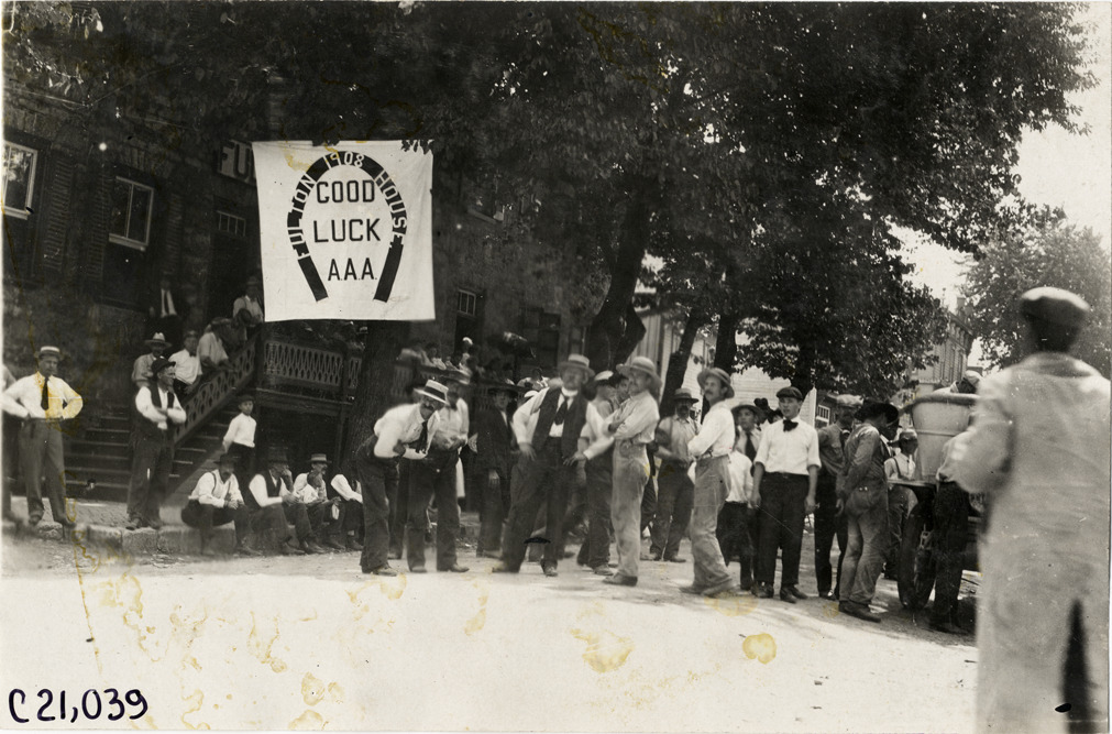 View of spectators and banner in front of the Fulton House at McConnellsburg, Pennsylvania during the 1908 Glidden Tour. Banner reads: "Good luck, A.A.A., Fulton House, 1908." Handwritten on back: "Tours--Glidden Tour, 1908."