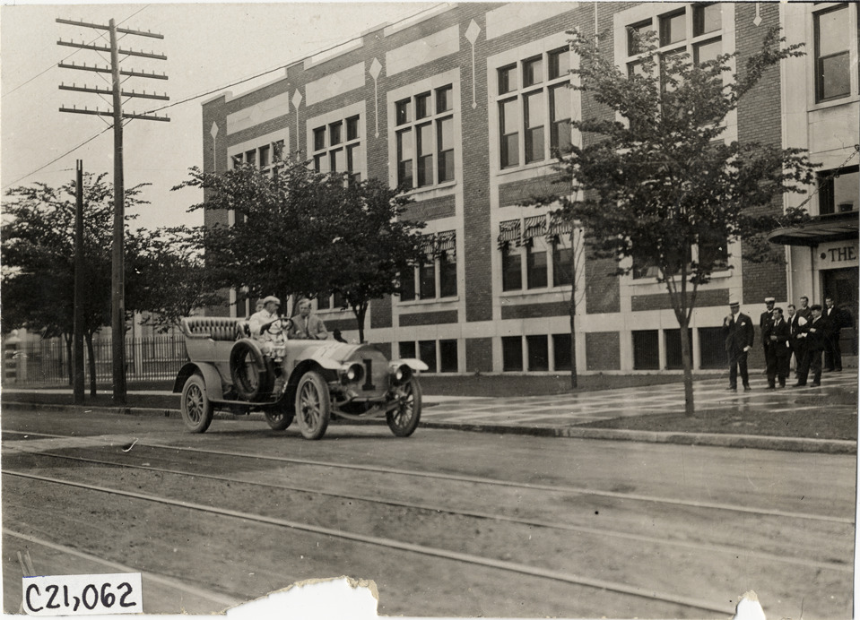 Motorists in Pierce Great Arrow automobile in front of office building, 1908 Glidden Tour