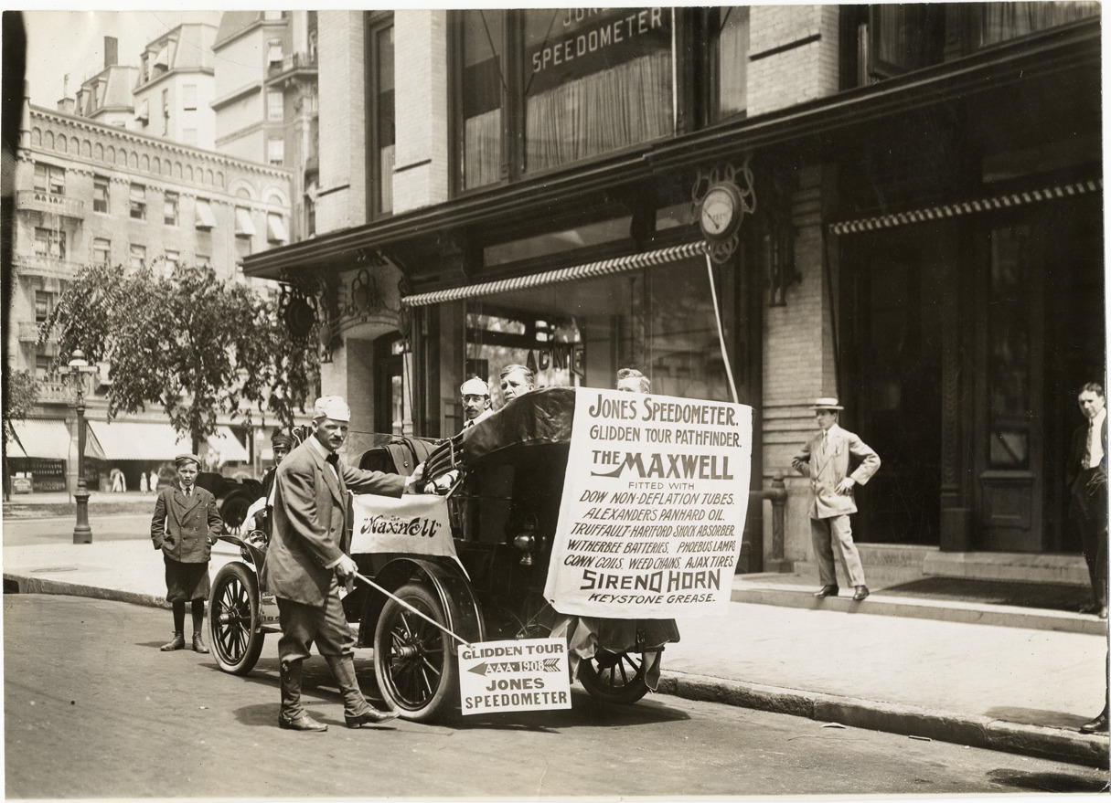 View of motorists posing with Maxwell car during the 1908 Glidden Tour. "The Maxwell," "Jones Speedometer, Glidden Tour pathfinder, the Maxwell, fitted with Dow non-deflation tubes. Alexander's Panhard oil, Truffault-Hartford shock absorber, Witherbee batteries, Phoebus lamps, Conn coils, Weed chains, Ajax tires, Sireno horn, Keystone grease" and "Glidden Tour, A.A.A., 1908, Jones Speedometers" signs are displayed on car. Storefront in background. Stamped on back: "Photo by N. Lazarnick, 29 West 42nd Street, N.Y., tel. 594 Bryant." Handwritten on back: "Tours--Glidden Tour, 1908."