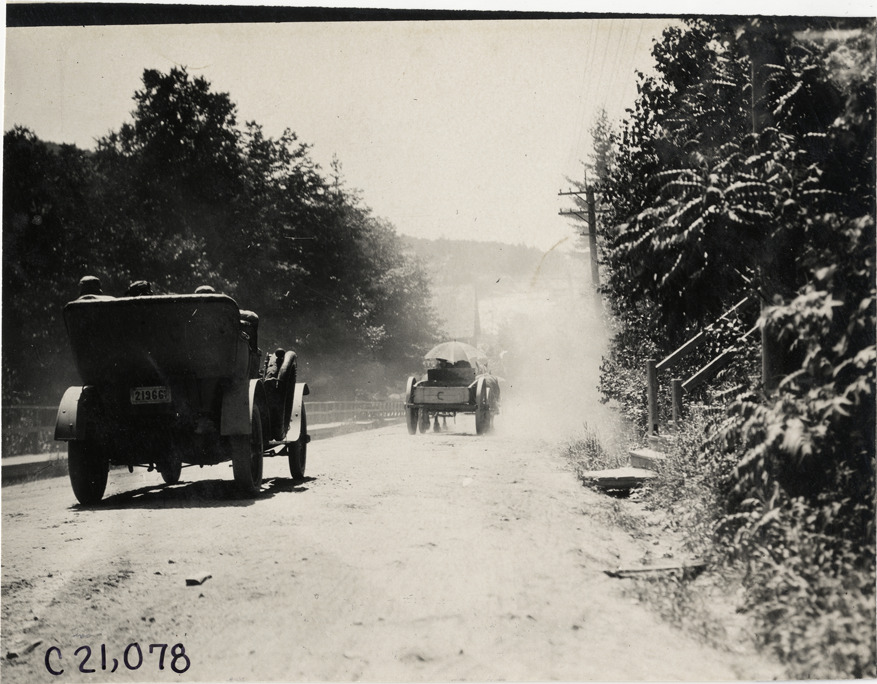 Automobile following horse-drawn wagon on rural road, 1908 Glidden Tour
