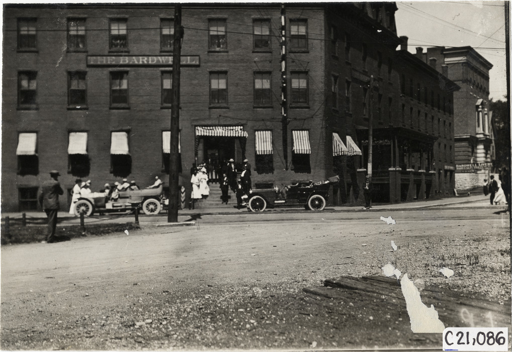 View of two cars parked in front of the Bardwell Hotel at Rutland, Vermont during the 1908 Glidden Tour. Handwritten on back: "Tours--Glidden Tour, 1908."