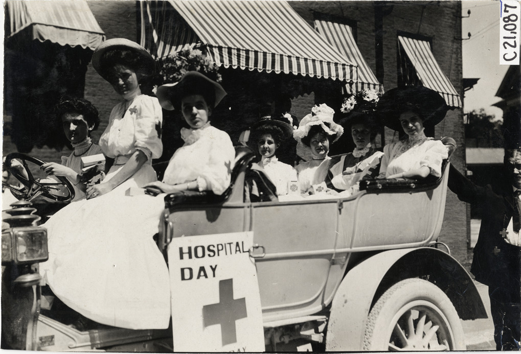View of women, wearing flowered hats and white dresses, posing in car for Hospital Day at Rutland, Vermont during the 1908 Glidden Tour. "Hospital Day" sign with cross is displayed on side of car. Handwritten on back: "Tours--Glidden Tour, 1908."