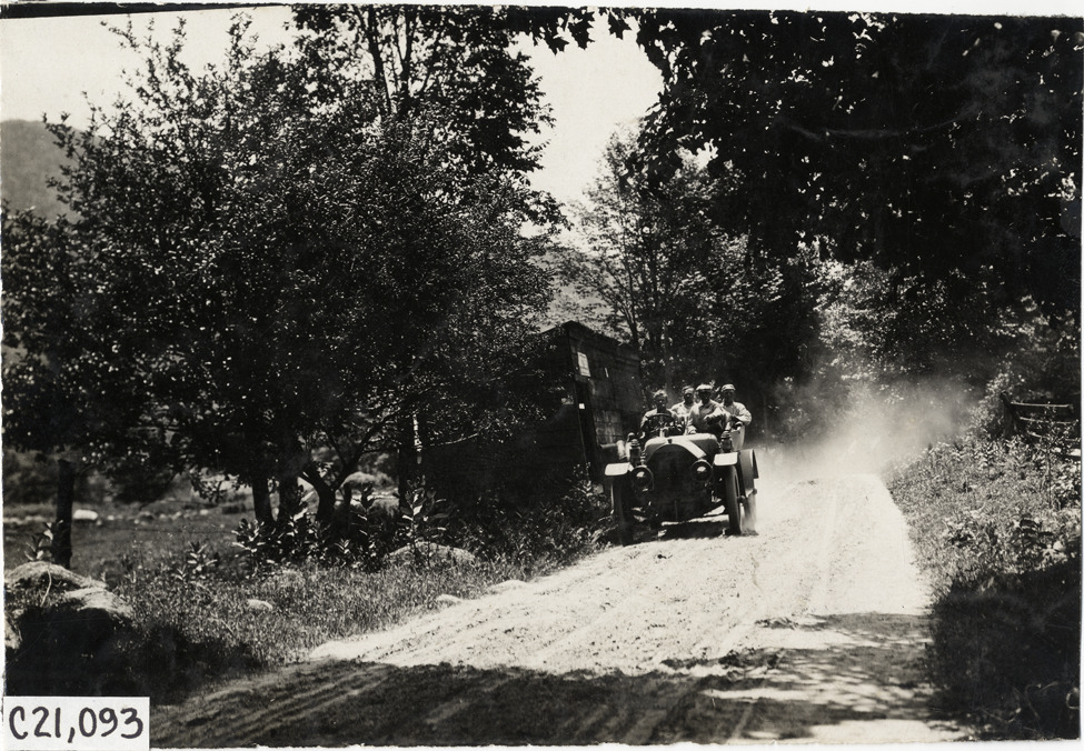 Motorists in Pierce Great Arrow automobile traveling on rural road, 1908 Glidden Tour