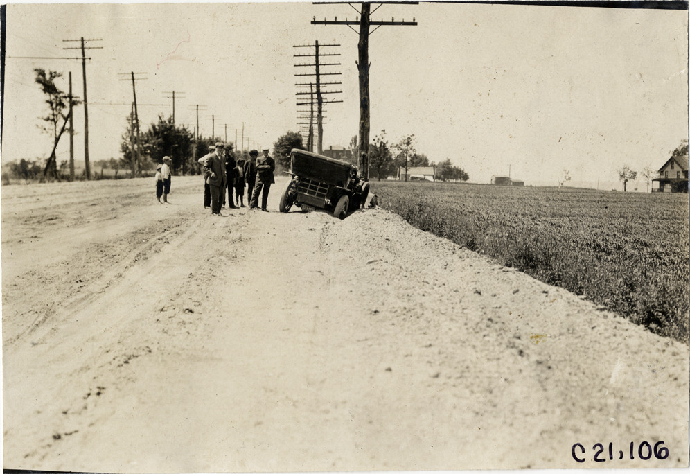 Distant view of motorists and spectators looking at aftermath of car accident on side of rural dirt road during the 1908 Glidden Tour. Car has collided with a utility pole. Handwritten on back: "Tours--Glidden Tour, 1908."