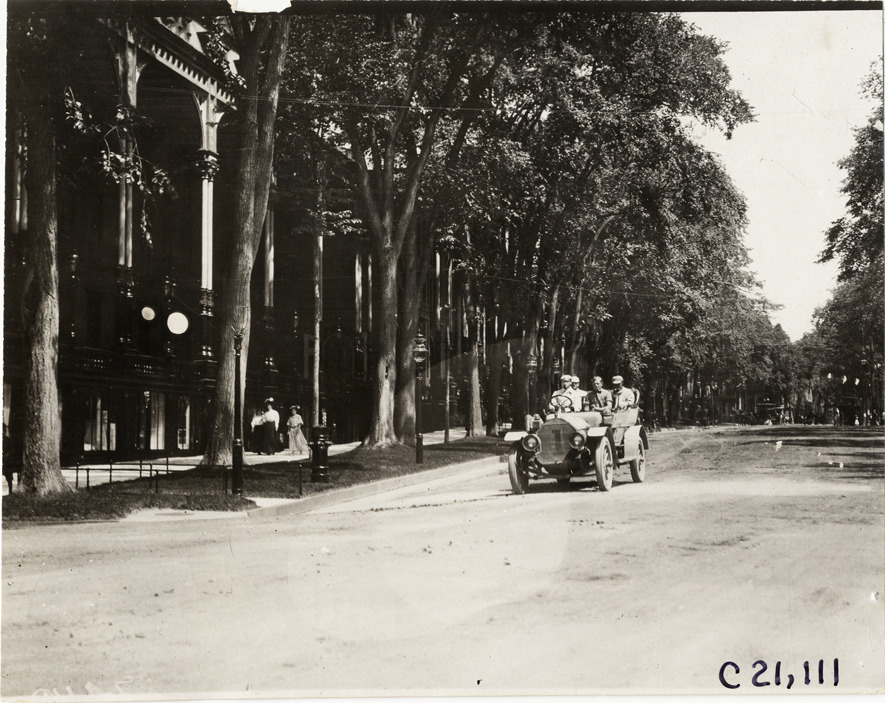 View of motorists in Pierce Great Arrow car no. 1 traveling past Grand Union Hotel at Saratoga Springs, New York during the 1908 Glidden Tour. Handwritten on back: "Tours--Glidden Tour, 1908."
