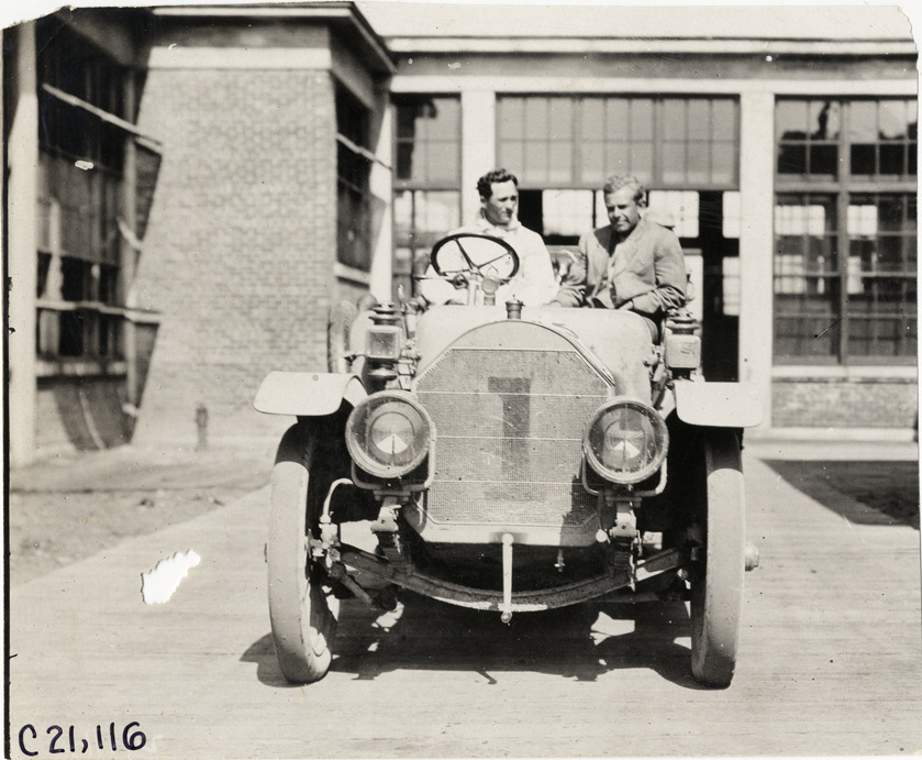 View of driver and passenger in Pierce Great Arrow car no. 1 during the 1908 Glidden Tour. Factory building in background. Handwritten on back: "Tours--Glidden Tour, 1908."