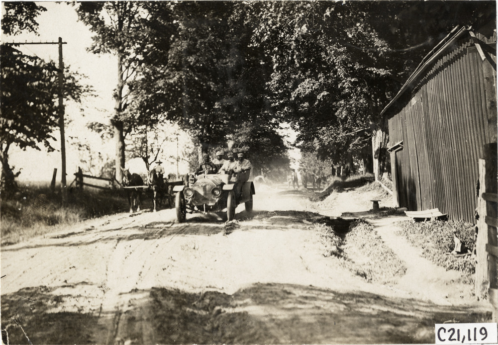 View of motorists in car traveling on rural dirt road during the 1908 Glidden Tour. Horse-drawn wagon in background. Stamped on back: "Spooner & Wells, Inc., photographers, telephones 3472-3473 Columbus, 1931 Broadway, New York." Handwritten on back: "Tours--Glidden Tour, 1908."