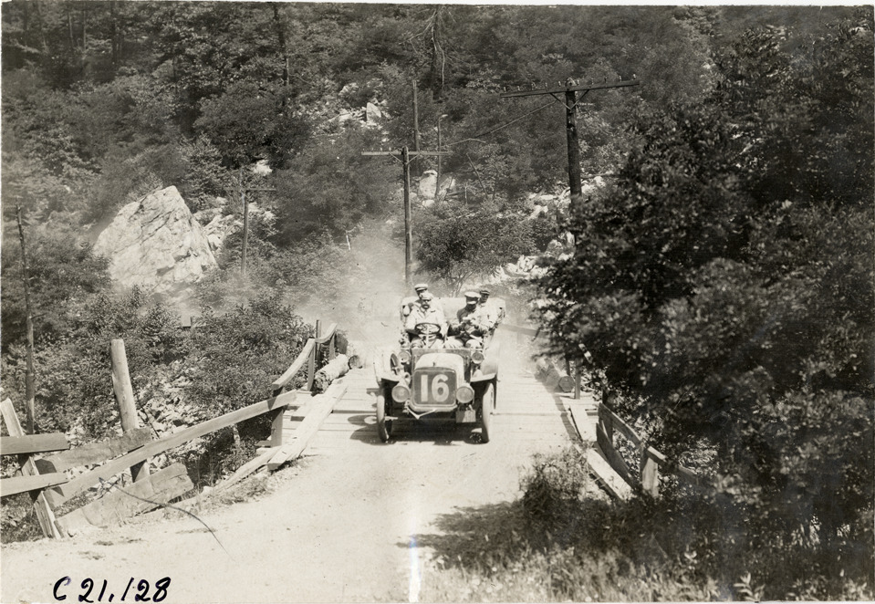 Favorite this☆ Motorists in Stevens-Duryea automobile crossing bridge, 1908 Glidden Tour Description: View of motorists in Stevens-Duryea car no. 16 crossing wooden bridge during the 1908 Glidden Tour. Handwritten on back: "Tours--Glidden Tour, 1908." Details Resource ID: na023703 Subject: Automobiles Stevens-Duryea Company Wooden bridges Glidden Tour (1908) Automobile driving--Competitions--United States Photographic prints Date Issued: 1908-07 Format: 1 photographic print ; 4.5 x 6.5 in. Member of: National Automotive History Collection Lazarnick Collection Filing Location: Tours--Glidden Tour, 1908 #27 Negative Number: Negative #C21,128 Rights: Physical rights are retained by DPL. Copyright is retained in accordance with U.S. copyright laws.